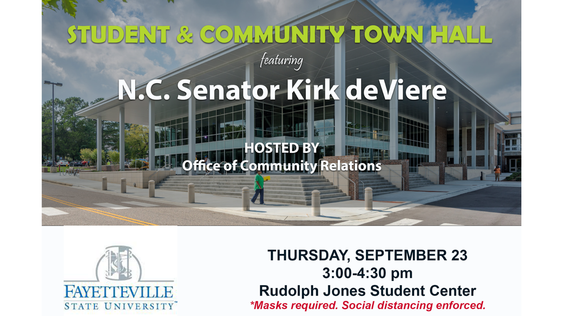 The Office of Senator Kirk deViere is hosting a town hall for students at Fayetteville State University on Thursday Sept 23 from 3:00-4:30pm.