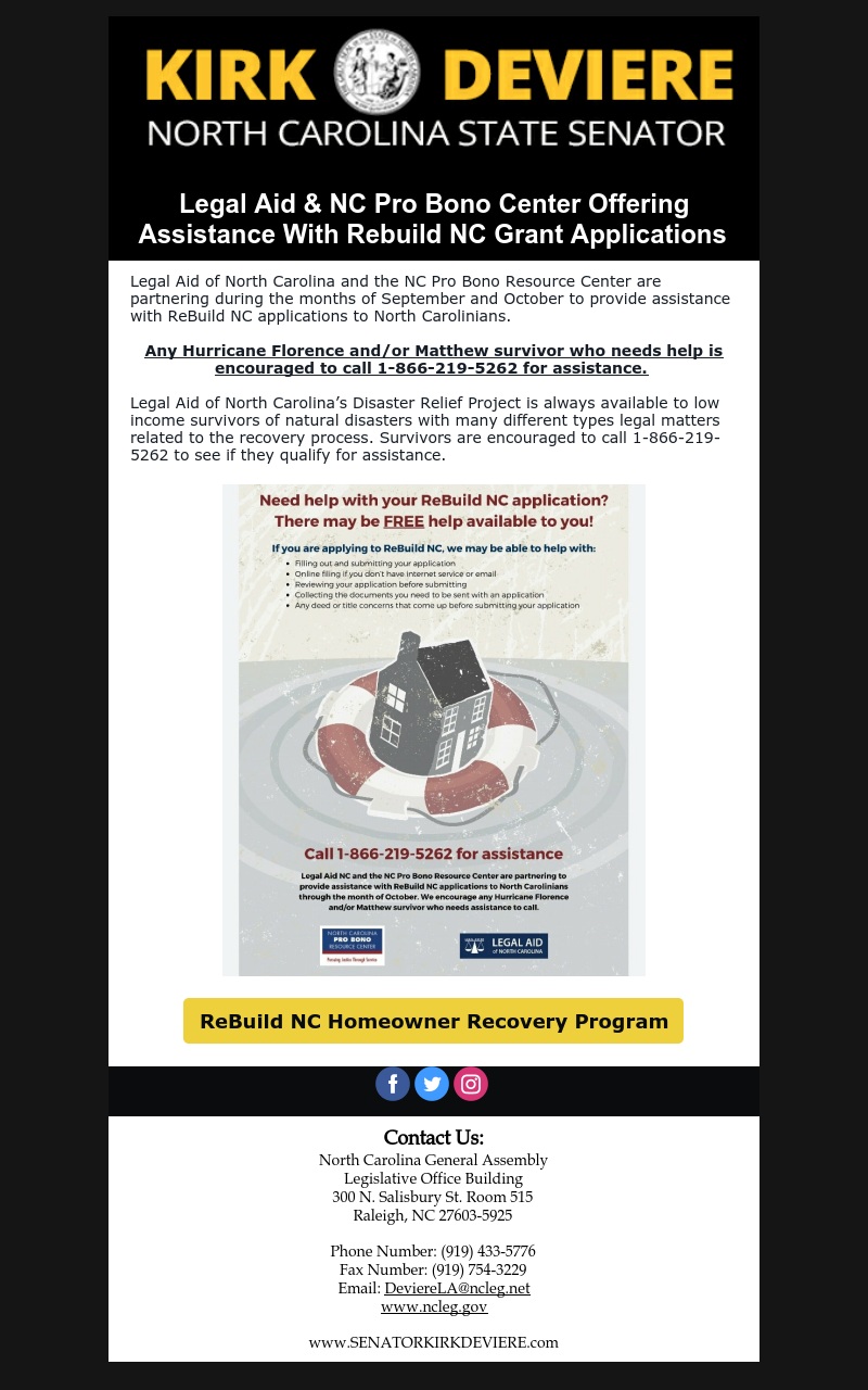 Legal Assistance Available for ReBuildNC Applications from Hurricane Florence/Matthew Recovery September 28, 2020