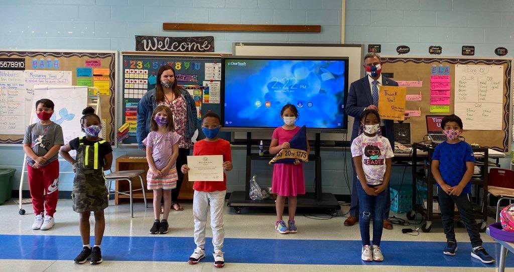 Above: Senator deViere delivers a flag that was flown over the state Capitol to a first grade class at Morganton Road Elementary School
