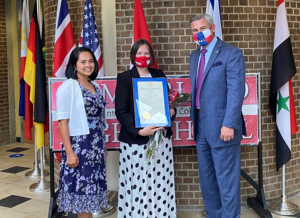 Above: Senator deViere and officials from the NC Department of Military and Veterans Affairs awards former NC teacher of the year and Cumberland International Early College teacher Maureen Stover with the Military Spouse Proclamation