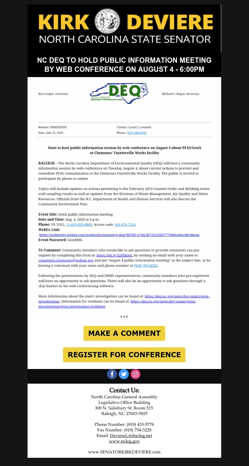 NC DEQ TO HOST PUBLIC INFORMATION SESSION ON PFAS/GENX