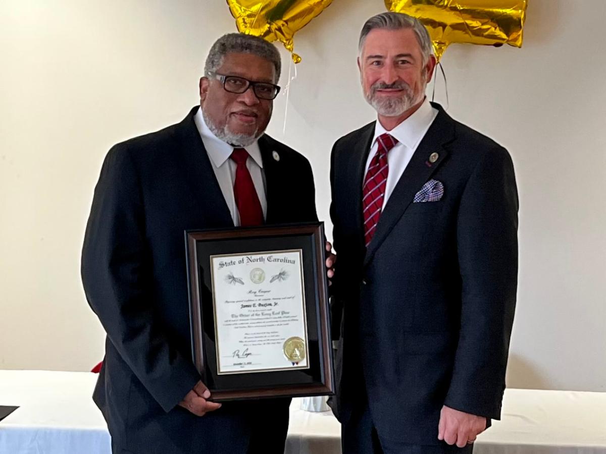 Above: Senator deViere presents NAACP President, Jimmy Buxton with The Order of The Long Leaf Pine Award