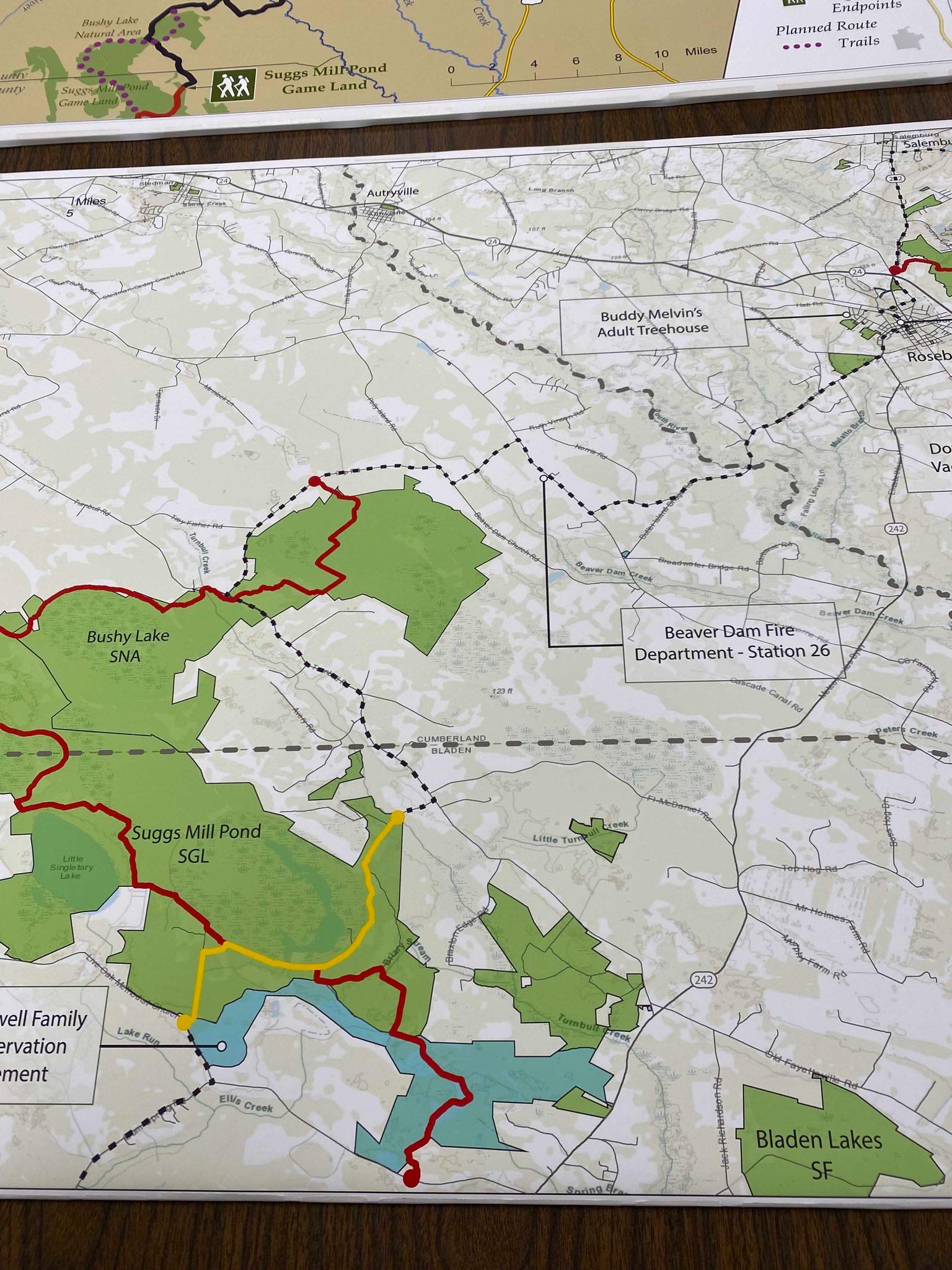 Above: Senator deViere attends a community meeting at Beaver Dam Fire Department about the Mountains to Sea Trail which goes through Cumberland.