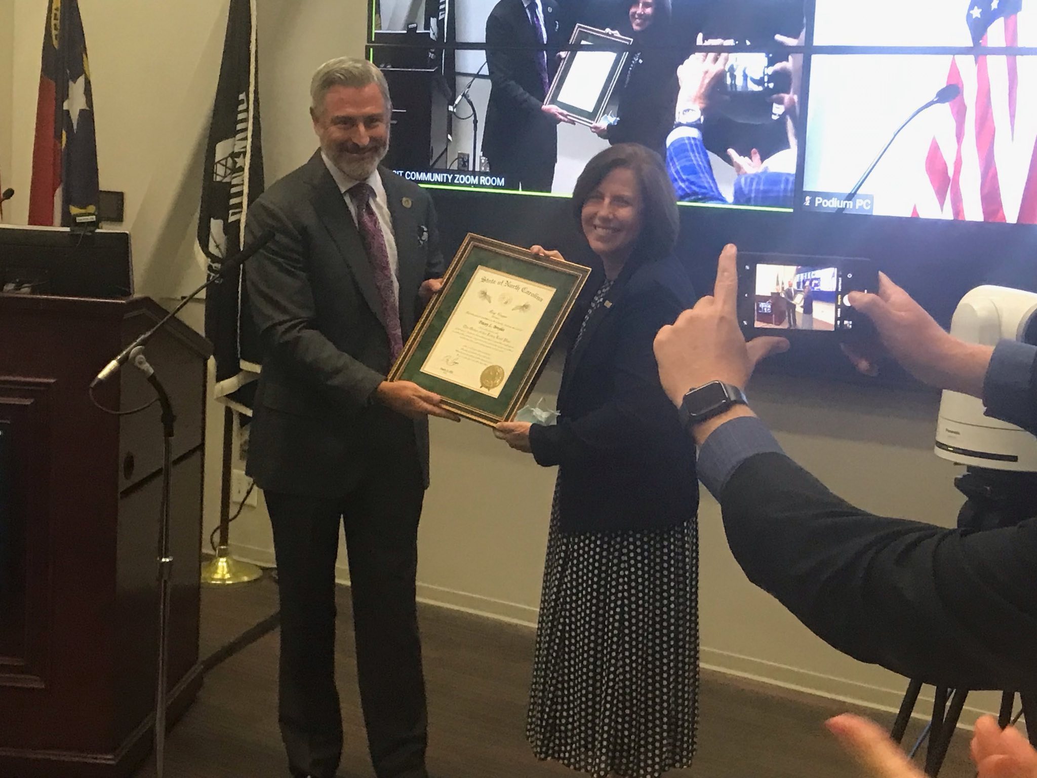 Above: Senator deViere presents the Order of the Long Leaf Pine to 30 year Fayetteville City employee Tracey Broyles.